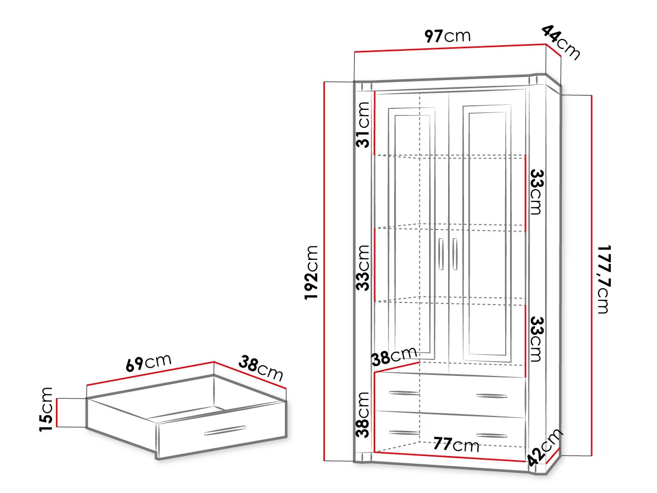 DALLAS barskab samt vitrineskab er udstyret med to rummelige skuffer samt glaslåger, der giver et godt indblik i møblet.